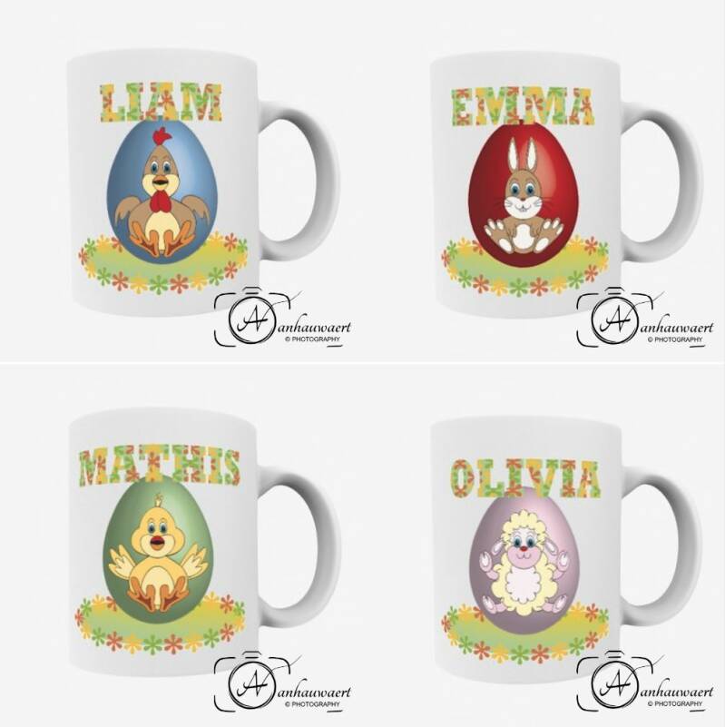 Kies een Paasfiguurtje, de kleur van het paasei en geef de naam door dat op de mok mag.